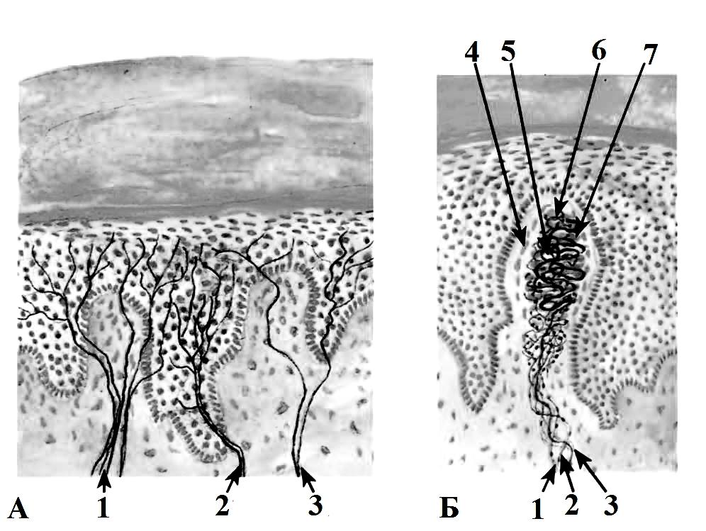 Б - инкапсулированное осязательное (тельце Мейснера): 1 – дендрит; 2 - нервное волокно; 3 - миелиновая оболочка; 4 - наружная колба; 5 - внутренняя колба (луковица); 6 - терминальные ветвления дендрита; 7 - леммоциты (шванновские клетки);
