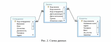 В результате должна получиться схема данных, представленная на рис. 2. В приведенном примере используются связи «один-ко-многим». На схеме данных они отображаются в виде соединительных линий со специальными значками около таблиц. Связь «один-ко-многим» помечается «1» вблизи главной таблицы (имеющей первичный ключ) и «∞» вблизи подчиненной таблицы (имеющей внешний ключ). Связь «один-к-одному» помечается двумя «1» (оба поля таблиц имеют первичные ключи). Неопределенная связь не имеет никаких знаков. Если установлено объединение, то его направление отмечается стрелкой на конце соединительной линии (ни одно из объединенных полей не является ключевым и не имеет уникального индекса).