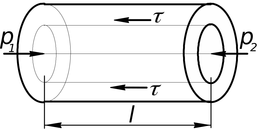 Двумя сечениями, отстоящими на расстоянии l друг от друга, выделим отсек трубопровода, и в нем цилиндр радиуса r. По Ньютону касательные напряжения