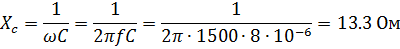 Рассчитаем индуктивное сопротивление катушки и емкостное сопротивление конденсатора для заданной частоты:
