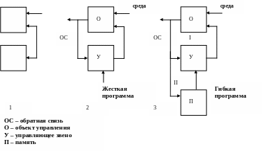 2 – программное изменение характера воздействия управляющего звена на объект (промежуточный этап) (рис.1(2) отличается от первого этапа наличием в управляющем элементе жесткой программы);