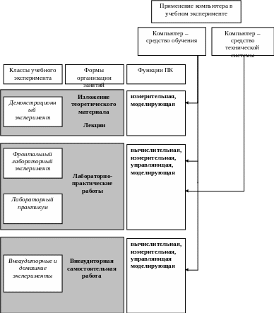 Проведенный анализ использования персонального компьютера и средств информационных и телекоммуникационных технологий в учебном эксперименте показал, что выделенные нами функции персонального компьютера: вычислительная, измерительная, управляющая и моделирующая реализуют разные его возможности при применении различных классов учебного эксперимента и, соответственно, разных форм организации учебной деятельности обучающихся (см. рис. 13).