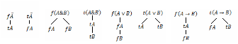 При помощи семантических таблиц Бета можно исследовать значение истинности данного высказывания без построения таблицы истинности, которая строится в теории булевых функций. Семантическая таблица – это дерево, вершинами которого является исследуемая формула и все ее подформулы. Вершина называется особой, если она отлична от атома, т.е. ее логическое значение зависит от последней выполняемой логической связки. Вершина называется обычной, если в ней находится атом. Последние вершины каждой ветви – это обязательно атомы, и такие вершины называются листьями. Семантическая таблица составного высказывания К строится индуктивно, исходя из семантических таблиц подформул, входящих в высказывание К. Каждой логической связке, выполняемой в соответствующей данной вершине подформуле, сопоставляется элементарная семантическая таблица в виде дерева, раскрывающего логическую интерпретацию связки. Примеры наиболее употребимых в логике высказываний связок приведены на рис. 1.