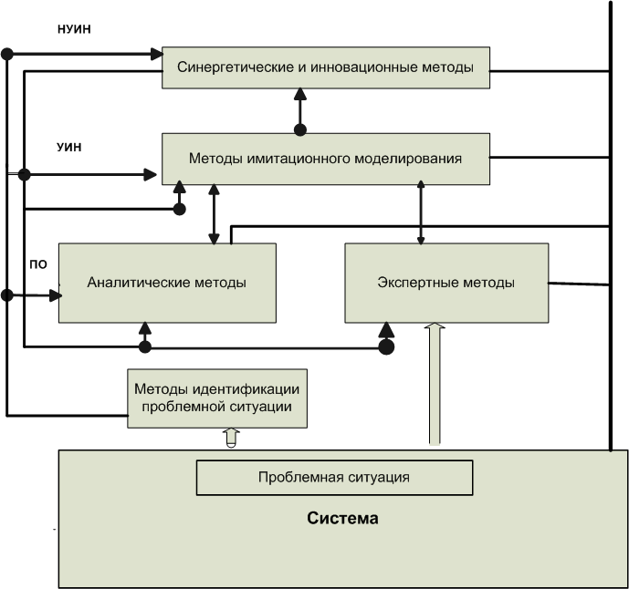 Один из вариантов интеграции методов для решения задач системного анализа представлен на рисунке 3. Здесь методы объединяются в зависимости от степени информативной определенности возникающей проблемной ситуации (ПС). При этом рассматриваются полностью определенная ситуация (ПО), ситуация с устранимой информативной неопределенностью (УИН), и ситуация с неустранимой информативной неопределенностью (НУИН).
