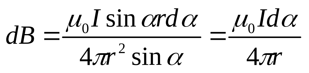 Прежде чем интегрировать выражение (1), преобразуем его так, чтобы можно было интегрировать по углу . Выразим длину элемента dl проводника через d. Согласно рис. 5, запишем