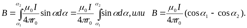 Чтобы определить магнитную индукцию поля, создаваемого отрезком проводника, проинтегрируем выражение (2) в пределах от 1 до 2: