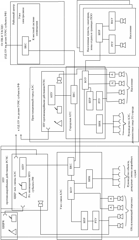 Проектирование и построение локальных систем оповещения должно проводиться в соответствии с рекомендациями [8]. В качестве примера приведем схему (рис. 3.3) и перечислим типовые мероприятия по организационно-техническому построению локальной системы оповещения в районе размещения атомной электростанции (АЭС):