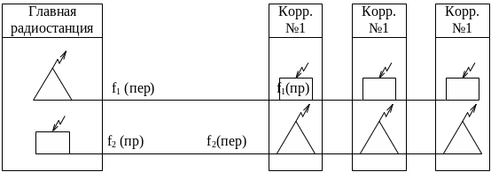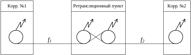 При ретрансляции на ретрансляционном пункте одна радиостанция принимает информацию от первого корреспондента на одной частоте и передает эту информацию второму корреспонденту на другой частоте (рис. 1.6) и аналогично в обратном направлении.