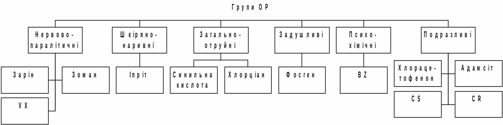 По фізіологічній дії ОР на організм розрізняють (рис. 6); нервово-паралітичної дії, які також називають фосфорорганічними ОР, тому що в складі їхніх молекул міститься фосфор; шкірно-наривної дії, загальнотруйної дії, ОР задушливої дії, психохімічні, подразливої дії.