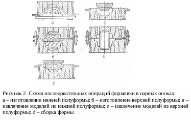 На подмодельную плиту устанавливают нижнюю часть модели, модели питателей и опоку, в которую засыпают формовочную смесь и уплотняют ее. Опоку поворачивают на 180 градусов, устанавливают верхнюю половину модели, модели шлакоуловителя, стояка и выпоров. По центрирующим штырям устанавливают верхнюю часть опоки, в которую засыпают и уплотняют формовочную смесь. Извлекают модель стояка и выпоров, раскрывают форму. Из полуформ извлекают составные части модели отливки, модели питателей и шлакоуловителей; в нижнюю полуформу устанавливают стержень и накрывают нижнюю полуформу верхней. К месту заливки жидкий металл доставляют ковшами. После заливки расплавленного метала его кристаллизации, и охлаждения литейную форму разрушают и извлекают отливки. Из выбитых отливок удаляются стержни затем удаляются литники, прибыли, заусенцы очищаются поверхности от пригоревшей формовочной смеси. Таким образом, для деталей подвижного состава получают например, корпус автосцепки.