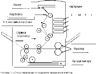 айважливішою частиною принтера е джерело світла - лазер та оптико-механічна система дзеркал і лінз, що переміщуе промінь лазера по поверхні фото барабана. Швидкість обертання дзеркала складае порядку 7-15 тис. об./хв. Для того, щоб збільшити швидкість друку не збільшуючи швидкість обертання дзеркала, його виконують у вигляді багатогранноі призми. Обертове дзеркало розгортае промінь у вигляді рядка прихованого зображення на поверхні фото барабана. Після формування рядка спеціальний кроковий двигун повертае барабан для формування наступноі. Цей зсув відповідае роздільній здатності принтера по вертикалі і зазвичай становить 1/300 або 1/600 дюйма.Процес утворення прихованого зображення на барабані нагадуе формування растра на екрані телевізійного монітора. Лазер генеруе дуже тонкий світловий промінь. Відбиваючись від грані призми, цей промінь освітлюе заряджену поверхню фото барабана, знімаючи заряд з фоторецептора в точці експонування. Для одержання точкового зображення лазер вмикаеться і вимикаеться за допомогою керуючого мікроконтролера. При цьому фонові ділянки фоторецептора залишаються зарядженими. При контакті тонер притягуеться підложкою у ділянки з низьким потенціалом, пробиті лазером. Зображення, сформоване на барабані, переноситься на папір і потім закріплюеться нагріванням (рис. 1). Схему пристрою кольорового лазерного принтера наведено на рис. 2.