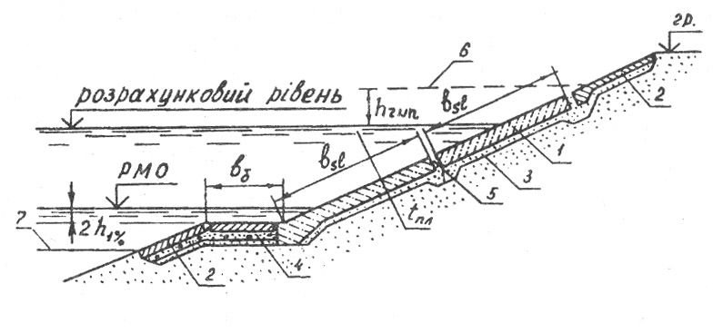 Ширина гребеня греблі приймається в залежності від категорії дороги що по ньому проходить. Мінімальна ширина дороги приймається 4.5 м. гребінь греблі без дороги не закріплюється. Для стоку води гребінь роблять з поперечним укосом по обидві сторони від осі цей уклон залежить від типу дороги. Вздовж дороги на греблі ставлять сигнальні стовпчики висотою 0.8-1.0 м на відстані один від одного 2м. Перевищення гребеня греблі над розрахунковим рівнем води визначається за двома розрахунковими випадками рівня води в верхньому бєфі. ( відмітці нормального підпірного рівня(НПР), на відмітці форсованого підпірного рівня (ФПР). Перевищення гребеня знаходять з вітрового нагону води , висоти накочування вітрових хвиль на укіс, забезпеченістю 1% і необхідного запасу а , Відмітка гребеня приймається по більшій відмітці гребеня греблі. 9. Кріплення укосів