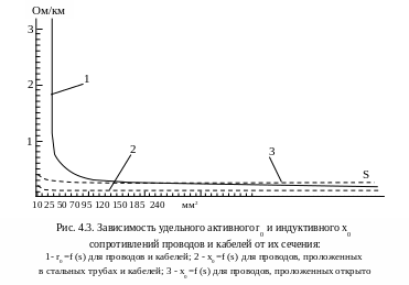 Рассмотрим зависимость ro и хо от сечения проводов и кабелей (рис. 4.3). Из рис. 4.3. видно, что для сечений проводов и кабелей до 25 мм2 (кривая 1) наибольшее значение имеет активное сопротивление. Для проводов, проложенных в стальных трубах и кабелей хо (кривая 2) мало (0,07 Ом/км) в сравнении с ro и практически не зависит от сечения. Для проводов, проложенных открыто (кривая 3), хо = 0,25 Ом/км.