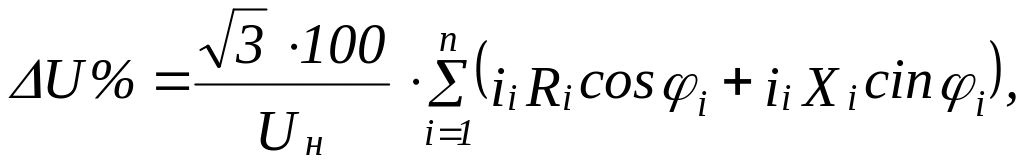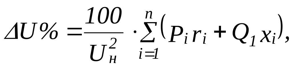 Отклонение напряжения (от Uн ) в любой точке сети рассчитывается по выражению