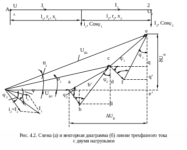 Uф = ad + cq - потеря напряжения на обоих участках линии или продольная составляющая падения напряжения, Uф - поперечная составляющая падения напряжения. После подстановки значений ad и cq получим