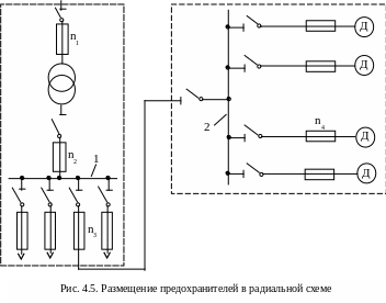 Примерное размещение предохранителей в радиальных схемах цеховых сетей показано на рис. 4.5. Выбор предохранителей для всех точек сети должен обеспечивать селективность (избирательность) их действия. При этом, естественно, предполагается размещение предохранителей по все убывающим величинам номинальных токов вставок.