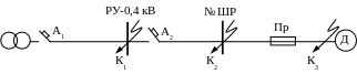 Рис. 4.7. Цепочка защит для построения карты селективности (к рис. 4.8): А1 – автомат ввода в РУ-0,4 кВ ТП 6-10/0,4 кВ; А2 – линейный автомат для защиты ШР; Пр – предохранитель; К1, К2, К3 – точки КЗ; РУ-0,4 кВ – типы подстанции; ШР – шкаф распределительный; Д – двигатель или какой нибудь другой ЭП; на цепочке также указаны максимальные расчетные и пусковые (пиковые) токи на различных участках цепочки |