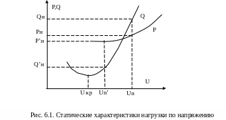 Если на рис. 6.1 горизонтальная прямая Рн характеризует поступление мощности в рассматриваемый узел (подстанцию) от электростанции системы, то пересечение ее с характеристикой нагрузки P = f(U) определяет уровень напряжения Uн , который может установиться у ЭП при наличии источников, способных выдать в тот же узел Qн .