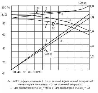 В связи с этим активная нагрузка генератора уменьшается не пропорционально уменьшению его cos, а несколько быстрее и при снижении активной нагрузки генератора от него нельзя получить номинальную полную мощность Sгн . Это иллюстрируется зависимостями S , cos и Q генератора от его активной нагрузки, приведенными на рис. 6.3.