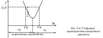 Технические характеристики синхронных машин как ИРМ одинаковы для всех видов синхронных машин. Они представляют собой плавно регулируемый ИРМ. За счет изменения тока возбуждения обеспечивается регулирование реактивной мощности по любому закону. На рис. 6.4 приведена так называемая V-образная характеристика СД, представляющая собой зависимость тока статора I от тока возбуждения Iв при Р = const . Левая ветвь кривой соответствует недовозбуждению СД, в этом режиме он, как и асинхронный, представляет собой активную и индуктивную нагрузки сети. Правая ветвь - режим перевозбуждения, в этом режиме СД представляют собой активную и емкостную нагрузки сети, т.е. работает не только как двигатель, но и как компенсатор Q .
