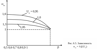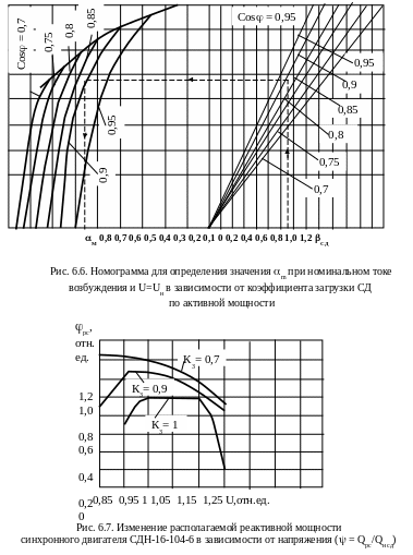На рис. 6.5 приведена зависимость m = f(, Uo) , а на рис. 6.6 номограмма для определения значения m при номинальном токе возбуждения и U = Uн в зависимости от коэффициента . Как уже отмечалось, СД нормальных серий изготавливаются с опережающим cos = 0,9 независимо от реактивной мощности, которую предприятие может использовать. Поэтому в расчетных затратах должна учитываться только стоимость активных потерь электроэнергии на генерацию реактивной мощности и стоимость регулятора возбуждения, если он устанавливается специально для этих целей.