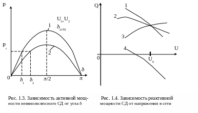 Как видно, реактивная мощность СД имеет две составляющие. Если первая больше второй, СД работает в режиме перевозбуждения, если наоборот - в режиме недовозбуждения.