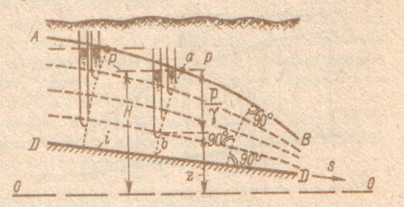 Все вопросы равномерного движения грунтовых вод решаются на основе уравнения Дарси Q= kфωЈ, а для плоской задачи при q = Q/B = kфhoЈ. Тогда глубина фильтрационного потока ho= q/kфЈ или ho= q/kфі, где і- уклон водоупора. В основу исследования неравномерного движения положена формула Дюпюи. Так выбрав сечение n- n (рис. 7.4) при неравномерном движении потока, напишем для него уравнение Бернулли H = z + p/γ + αυ2/2ġ. Учитывая, что p/γ =h и равна глубине потока, а величина αυ2/2ġ бесконечно мала и ей можно пренебречь, тогда H = z + h. Продифференцировав это уравнение и разделив на –dS, получим –dH/dS =-dZ/dS – dh/dS, где -dH/dS = J- уклон свободной поверхности, а -dZ/dS = i – уклон дна. Подставив это уравнение в уравнение расхода Q = kфω(і - dh/dS) или для погонного расхода q = kфh(і - dh/dS) основное уравнение движения грунтовых вод(первая форма). Для равномерного движения грунтовых вод это уравнение выглядит q = kфho і, где ho- глубина равномерного режима движения фильтрационного потока, но так как ho і = h(і - dh/dS), тогда kфho і = kф h(і - dh/dS), разделив на kф получим уравнение во второй форме dh/dS = і (h – ho)/h.