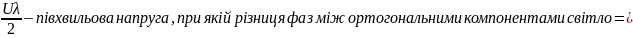 Електрооптичний кристал покритий з обох сторін електродами з отворами до яких подається керуюча напруга Uk, ПРИ ПОДАЧІ НАПРУГИ НА ЕОК лінійно поляризоване випромінювання трансформується в еліптично поляризоване випромінювання, після нього через аналізатор пройде тільки та складова потоку, вектор поляризації якої співпадає з площиної її поляризації, при зміні напруги на електродах змінюється ексцентриситет еліпса поляризації, відношення між модулями векторів поляризації звичайному і незвичайному променів , кут між якими =90*