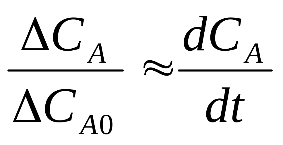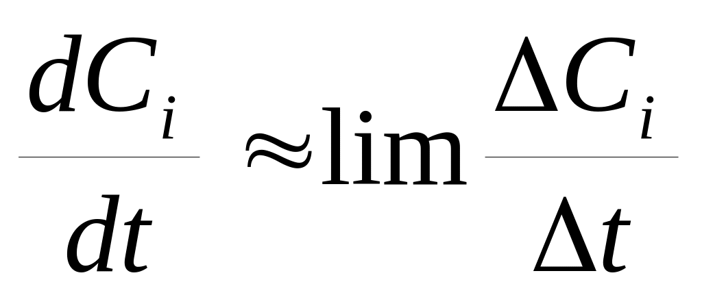 Воспользуемся численным методом интегрирования. Для этого разобьем ось времени на малые отрезки (шаги). Считая, что производные концентраций веществ по времени есть математический предел отношения приращений концентраций к приращению времени, при Δt ,стремящемся к нулю: