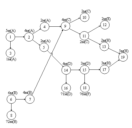 Реакция (4) идет сообразованием веществ F и Н. Масса образующихся в ней веществ обусловлена расходом D в количестве, соответствующем вершине 15. Обозначим вершиной 18 массу вещества F, образующуюся по реакции (4), а вершиной 17 – массу вещества Н, образующуюся по этой же реакции. Общую массу вещества Н в системе обозначим вершиной 19. Полученный граф, приведенный ниже на рисунке, полностью отображает ход всех химических реакций в рассматриваемой системе.