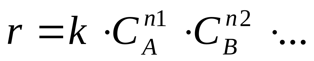 где k – константа скорости химической реакции, СА,СВ – концентрации веществ, n1, n2 – порядки по соответствующим веществам. Это выражение известно в физической химии как закон действующих масс.