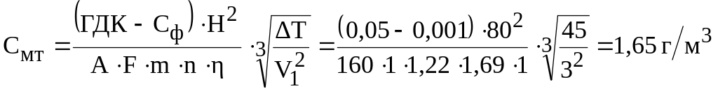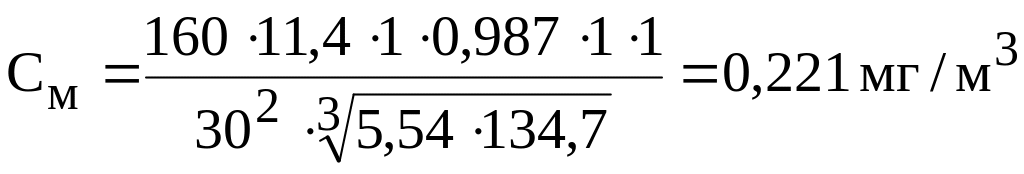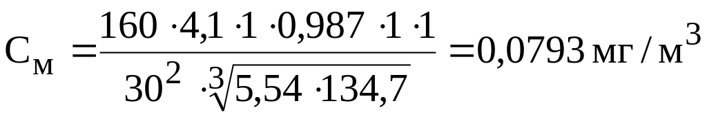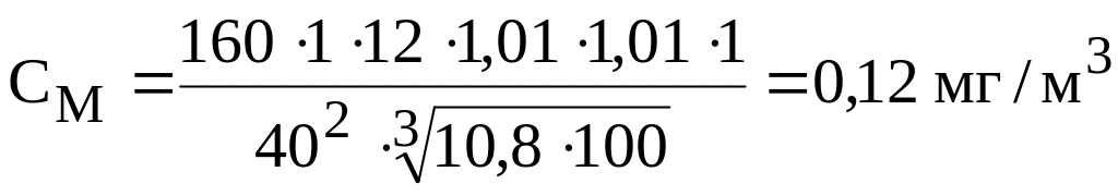 Величина максимальної приземної концентрації шкідливих речовин См (мг/м3) для викиду нагрітої газоповітряної суміші від одиночного джерела з колоподібним устям на відстані хм від джерела проводять за формулою: