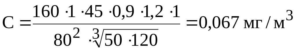 - для газоподібних шкідливих речовин та дрібнодисперсних аерозолів, швидкість осідання найбільш крупних фракцій яких не перевищує 3-5 см/с – 1,0;