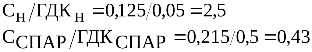 Приклад 6.1.3. У водоймі рибогосподарського призначення виявлені нафтопродукти з концентрацією 0,125 мг/л і СПАР у кількості 0,215 мг/л. Чи припустима така кількість домішок забруднювачів з точки зору санітарно-гігієнічних вимог?