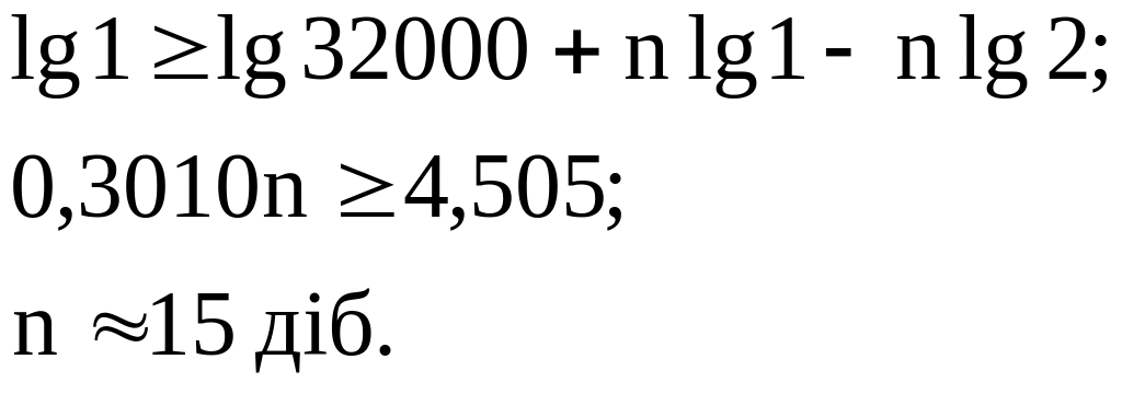 Приклад 6.1.4. Визначити, через скільки діб концентрація домішок у воді водойми стане рівною або меншою 1ГДК, якщо після скидання стічної води підприємством концентрація домішок дорівнювала Со=32000ГДК, а за рахунок самоочищення водойми концентрація домішки кожної доби зменшується в