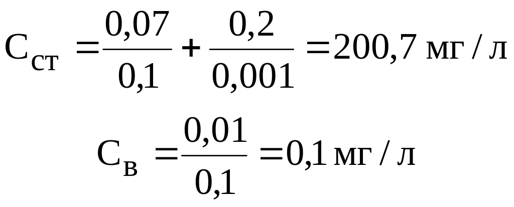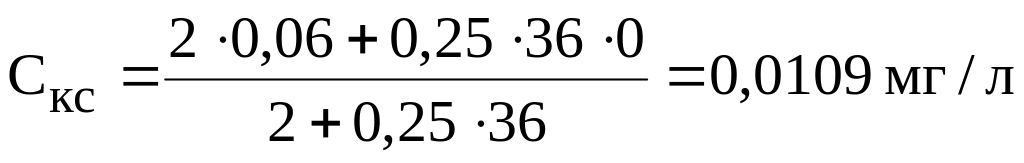 Задача 11. Стічні води (СВ)( q=4 м3/с), що містять, мг/л: As – 0,1; Hg – 0,001; бензол – 0,6; фенол – 0,003; ПАР – 1,0; скидаються у водойму господарсько-питного призначення (Q=102 м3/с). Фонова концентрація у водоймі та ГДК забруднюючих речовин (ЗР) характеризуються наступними значеннями, мг/л: As – 0,02 (0,05); Hg – 0,0002 (0,0005); бензол – 0,03 (0,5); фенол – 0,0005 (0,001); ПАР – 0,2 (0,5). Коефіцієнт змішування – 0,45. Визначити необхідний ступінь очищення СВ від розчинених ЗР, розрахувати концентрацію ЗР у контрольному створі та обґрунтувати висновок щодо допустимості скидання СВ.