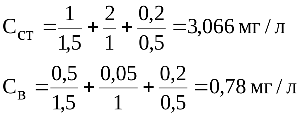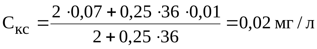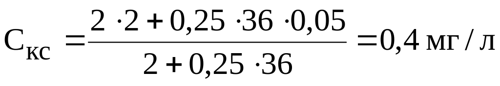 Задача 5. Витрата стічних вод складає 0,4 м3/с. Найменша середньомісячна витрата води у річці складає 26,8 м3/с. Середня швидкість течії ріки на розрахунковій ділянці = 0,19 м/с, середня глибина води ріки – 1,8 м. Коефіцієнт звивистості русла 1,22. Відстань від місця випуску стічних вод до розрахункового створу 600 м. Випуск стічних вод передбачається у річковий потік. Визначити коефіцієнт змішування та кратність розведення перед розрахунковим пунктом водокористування.