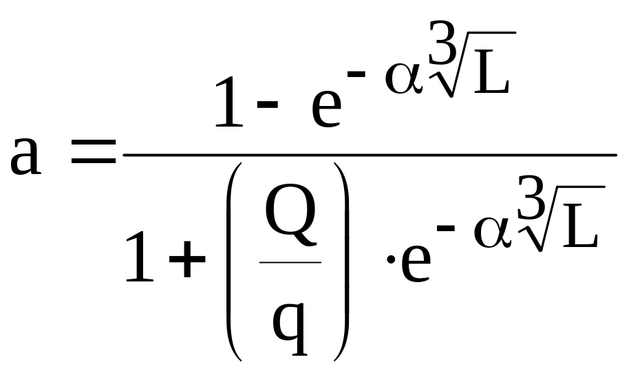 де Q – витрата води у створі, м3/с; q – витрата стічної води, м3/с; L – довжина русла від випуску стічних вод до розрахованого створу (за течією), м; е – основа натурального логарифму; α – коефіцієнт, що враховує гідравлічні фактори змішування та визначається за рівнянням: