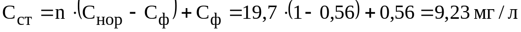 Приклад 8.1.1. Витрата стічних вод підприємства, які скидаються у річковий потік, складає 0,24 м3/с. Середньомісячна витрата води у річці дорівнює19,5 м3/с. Середня швидкість течії ріки на розрахунковій ділянці – 0,15 м/с, середня глибина ріки – 1,8 м. Коефіцієнт звивистості русла – 1,17. Відстань від місця випуску стічних вод до розрахункового створу дорівнює 750 м. Визначити а та n стічних вод перед розрахунковим пунктом водокористування.