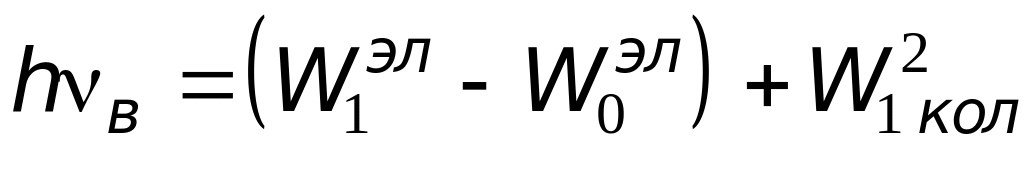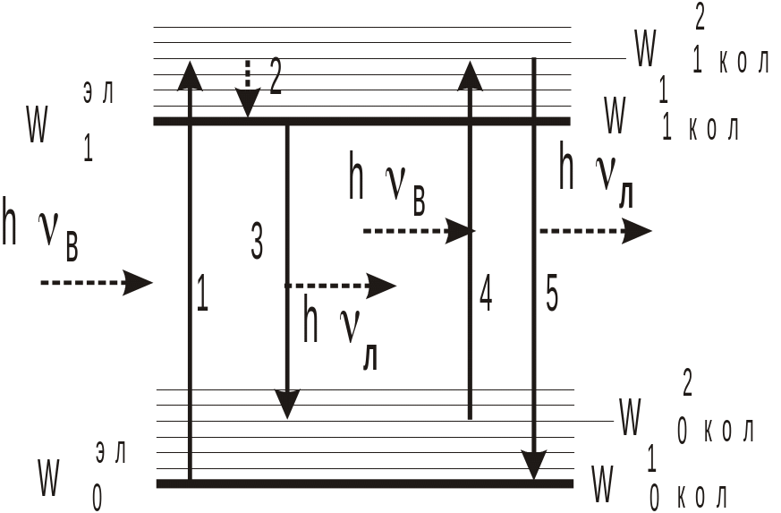 Энергия молекулы в этом случае состоит из энергии электронов Wэл и энергии колебаний атомов Wкол, имеющих дискретный ряд значений. При этом Wкол <<Wэл и колебательные уровни расположены более тесно по сравнению с электронными, Типичная схема энергетических уровней молекулы показана на рис. 1.