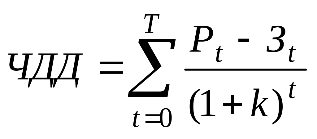 Чистый дисконтированный доход (чистый приведенный эффект) (ЧДД) основан на методологии дисконтирования денежного потока и представляет собой разность между всеми полученными дисконтированными доходами за время реализации инвестиционного проекта и дисконтированной величиной инвестированного капитала и других выплат. Чистый приведенный эффект рассчитывается по следующей формуле: