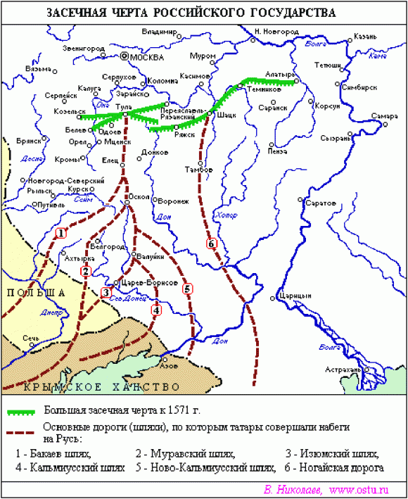 Поэтому на юге ограничились мерами пассивной обороны. Между Россией и Крымским ханством лежало открытое пространство (лесостепь, переходившая в степь), носившее название «Поле». В первой половине XVI в. оно начиналось сразу за Тулой. Для защиты от татар в середине XVI в. была построена Тульская засечная черта, представлявшая собой цепь городов-крепостей, соединенных лесными засеками, завалами и рвами, пересекавшими пути татарских набегов.(3)