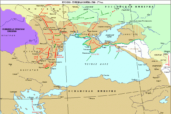 Русские армии взяли Хотин, Яссы, Бухарест, Азов. Был восстановлен Азовский флот. В 1770г. П.А.Румянцев одержал блестящие победы над численно превосходящими силами турок у Рябой Могилы, при Ларге и Кагуле. Были заняты Измаил, Килия, Аккерман, Браилов, Бендеры. На Средиземном море в Чесменской бухте был уничтожен турецкий флот.