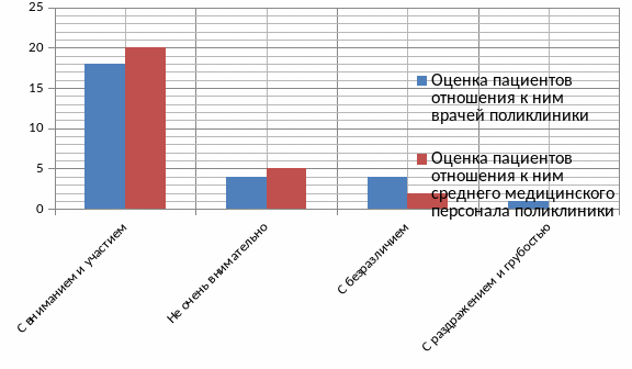 Одной из главных задач проведенного исследования являлась оценка уровня удовлетворенности пациентов отношением к ним медицинского персонала поликлиники, а также профессиональным уровнем работы врачей поликлиники и медицинских работников среднего звена. Так на вопрос «Как вы оцениваете отношение к Вам врачей поликлиники?» 18 пациентов ответили, что врачи относятся к ним с вниманием и участием, 4 пациента – не очень внимательно, 4 пациента ответили, что врачи поликлиники относятся к ним с безразличием и 1 пациент – с раздражением и грубостью.