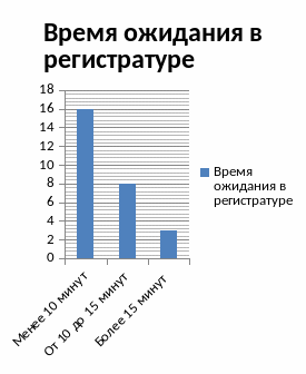 В ходе анализа работы регистратуры поликлиники 14 пациентов не отметили недостатков в работе регистратуры, 6 пациентов отметили невежливое к ним отношение работников регистратуры, 6 пациентов отметили, что недостаток работы регистратуры заключается в нерациональной организации работы регистратуры, о чем свидетельствуют длинные очереди и длительность ожидания и 1 пациент ответил, что предпочитает хранить свою амбулаторную карту дома и в регистратуру обращается редко. При этом 16 пациентов ответили, что обычно на ожидание в регистратуре они затрачивают менее 10 минут, 8 человек ответили, что в регистратуре обычно затрачивают от 10-15 минут и 3 человека отметили, что затрачивают более 15 минут на ожидание в регистратуре.