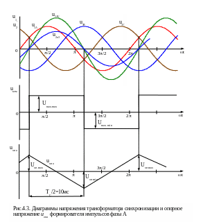 Для работы СИФУ используется линейное пилообразное опорное напряжение, максимальное и минимальное значения которого находяся в точках естественной коммутации вентилей.