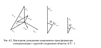 Для правильной работы тиристоров преобразователя необходимо чтобы максимальное и минимальное значения опорного напряжения находились в точках естественной коммутации. данное условие, как видно из векторной (рис.4.2) и временных диаграмм (рис.4.3), может быть выполнено, если использовать трансформатор синхронизации с группой соединения обмоток /Y – 1.
