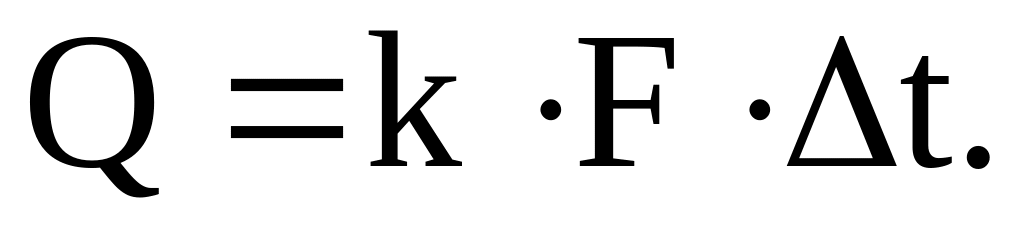 При расчете теплообменных аппаратов изменение температур теплоносителей при их движении по теплообменнику учитывается введением в расчетную формулу среднего логарифмического температурного напора Δt. Влияние остальных факторов учитывают введением коэффициента теплопередачи k, который по физическому смыслу представляет собой количество тепла, передаваемого в единицу времени через единицу поверхности нагрева при разности температур между теплоносителями в один градус. Формула для расчета количества тепла, передаваемого в теплообменном аппарате за единицу времени, имеет вид: