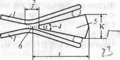 Схема крестовины: 1—усовик; 2 — вредное пространство; 3 желоб; 4— сердечник; 5—хвост крестовины; 6— математический центр