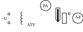 Испытуемое сопротивление R (проводниковый материал) подключено к источнику переменного тока ~U 220 В через регулировочный трансформатор АТV. Последовательно испытуемому сопротивлению R включён амперметр PA, для определения тока проходящего через сопротивление. Параллельно испытуемому сопротивлению R включён вольтметр PV, для определения падения напряжение на сопротивлении. Нагрев осуществляется рабочим током. Температура нагрева определяется с помощью термометра, расположенного вблизи сопротивления R.